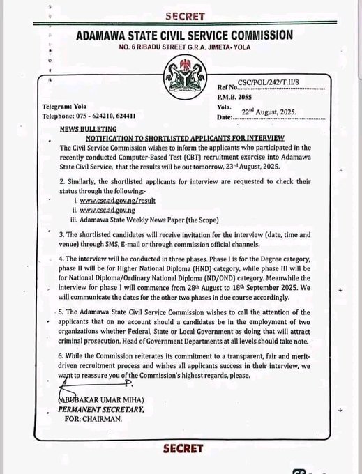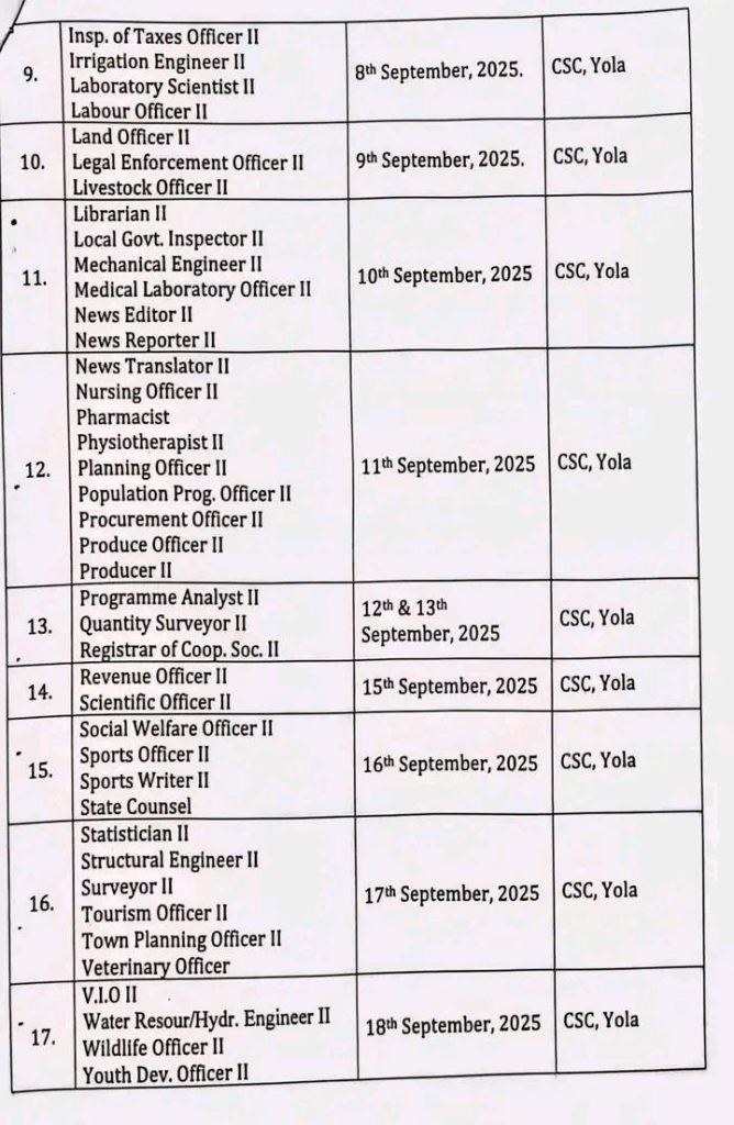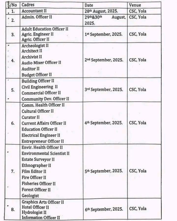 The next phase, which is the interview stage for all cadres, will officially commence on Thursday, August 28, 2025, at the CSC headquarters in Yola.