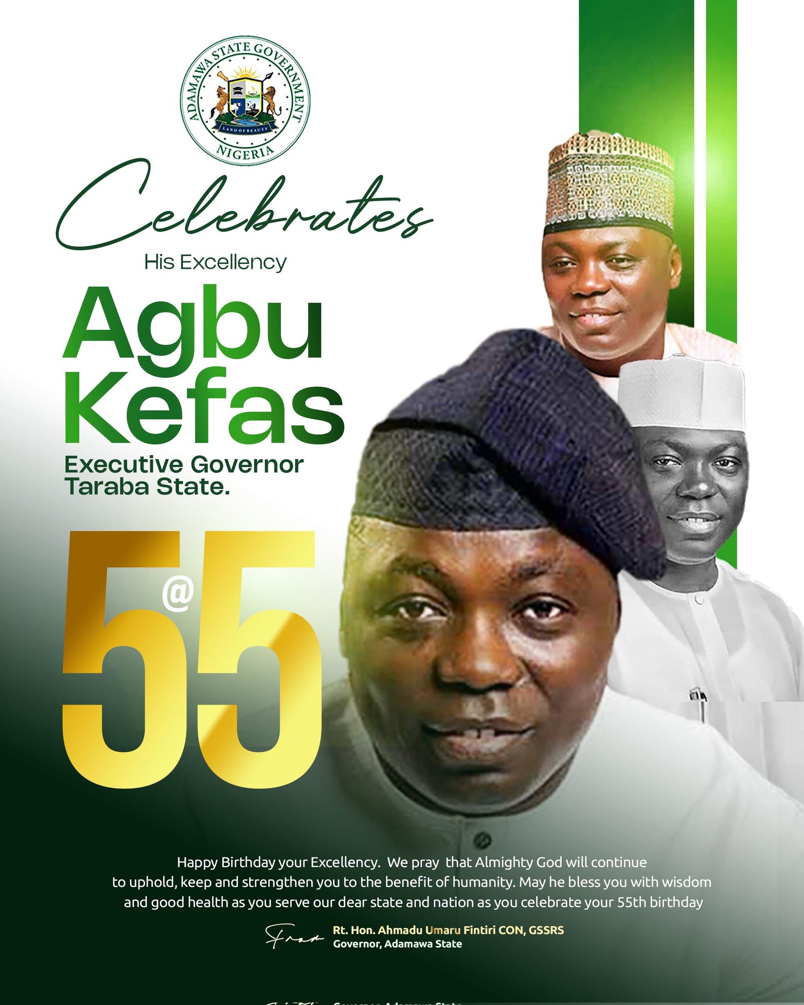 Governor Ahmadu Umaru Fintiri has extended warm birthday wishes to his colleague, Governor Agbu Kefas of Taraba State, on the occasion of his 55th birthday.